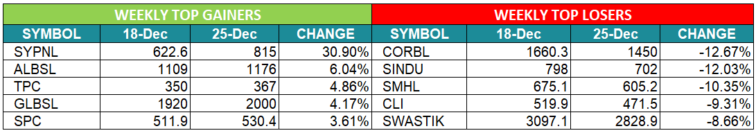यस साता एसवाई प्यानल नेपालको शेयरमूल्य सर्वाधिक ३०.९० प्रतिशत बढेको छ। गत साता ६२२ रुपैयाँ ६० पैसामा अन्तिम कारोबार भएको सो लघुवित्तको शेयर यस साता ८१५ रुपैयाँमा अन्तिम कारोबार भएको छ। अन्य स्टकहरुको मूल्य वृद्धिदर ७ प्रतिशतभन्दा कम रहेको छ। यस साता कर्पोरेट डेभलपमेन्ट बेंकको शेयरमूल्य सर्वाधिक १२.६७ प्रतिशत घटेको छ। त्यस्तै, यस साता सिन्धु विकास बैंकको शेयरमूल्य १२ प्रतिशतभन्दा बढी बढेको छ भने सुपर मादी हाइड्रोपावरको शेयरमूल्य करिब साढे १० प्रतिशत घटेको छ।