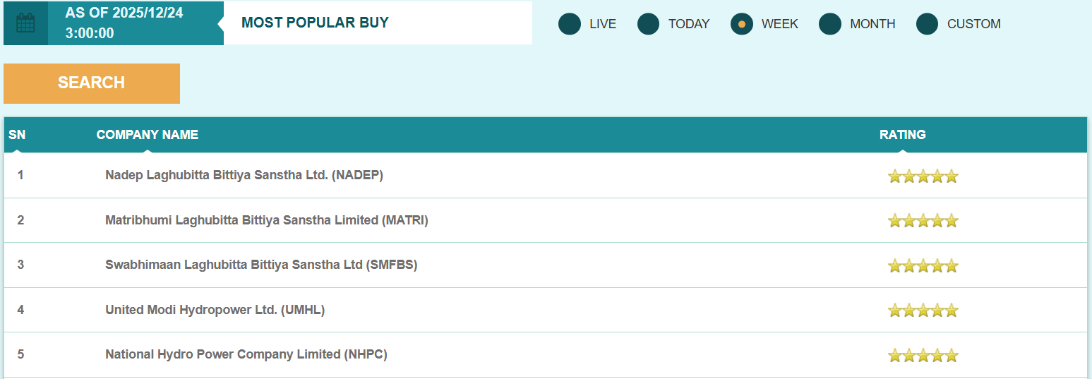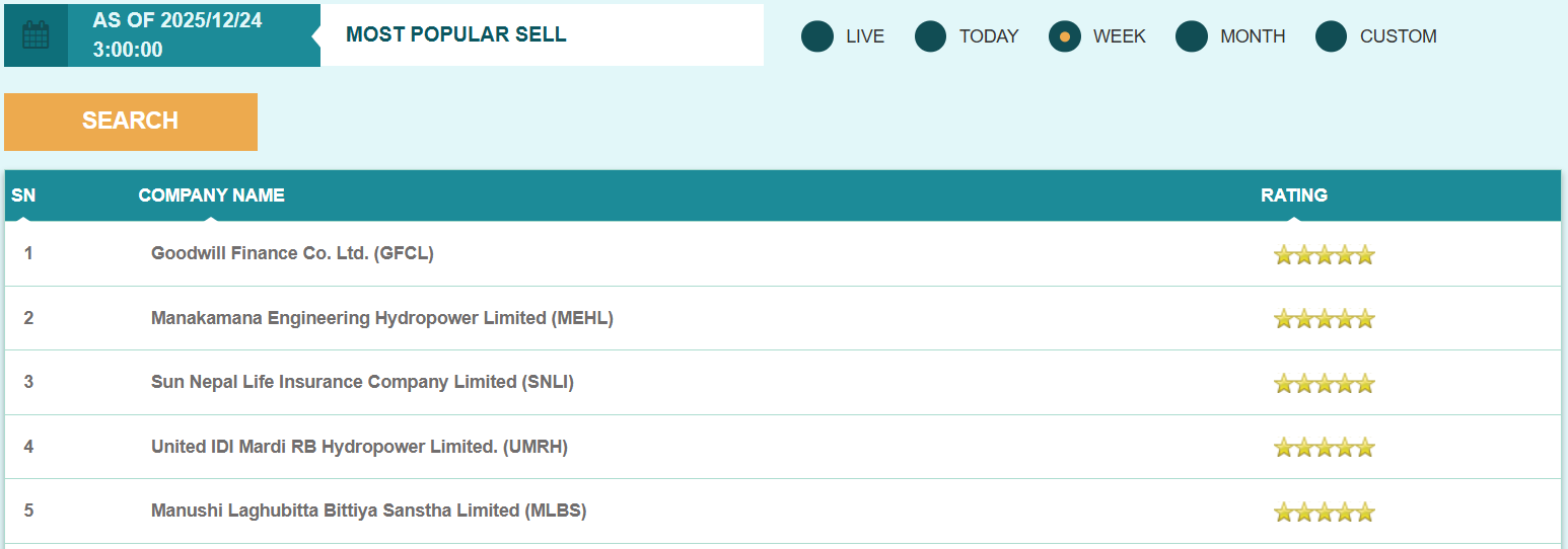 फ्लोरसिट विश्लेषण गर्दा यस साता नाडेप लघुवित्त वित्तीय संस्था, मातृभुमि लघुवित्त वित्तीय संस्था र स्वाभिमान लघुवित्त वित्तीय संस्था लगायतका स्टकहरु मोस्ट पपुलर बाइ स्टक सूचीको शीर्ष स्थानमा रहेका छन् भने गुडविल फाइनान्स, मनकामना इन्जिनियरिङ्ग हाइड्रोपावर, सन नेपाल लाइफ इन्स्योरेन्स कम्पनी लगायतका स्टकहरु मोस्ट पपुलर सेल स्टक सूचीको शीर्ष स्थानमा रहेका छन्।