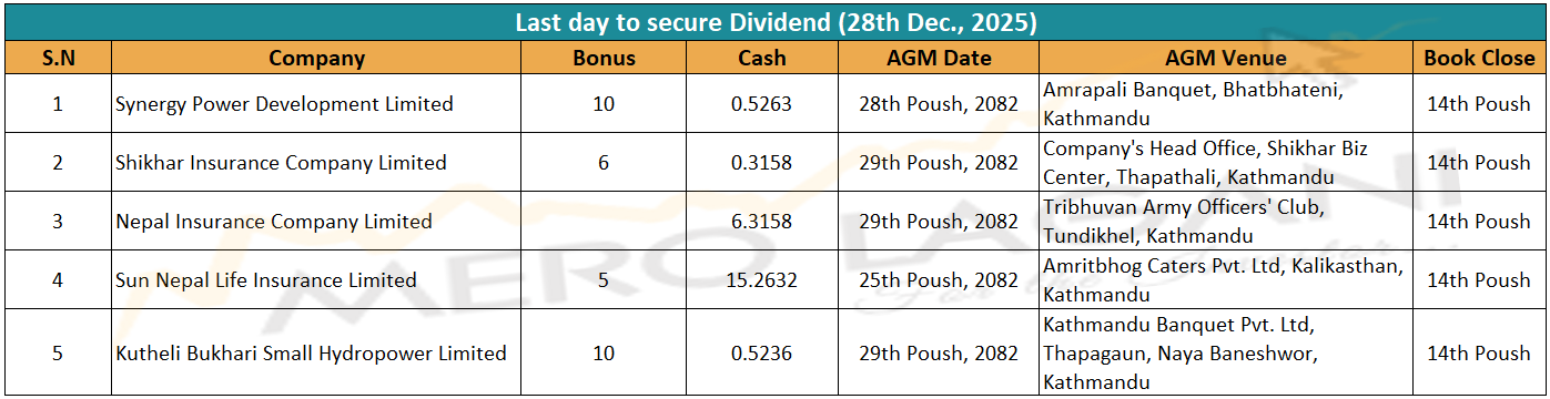 पुस १३ गते, आइतबार, ५ कम्पनीको लाभांश सुरक्षित गर्ने अन्तिम दिन रहेको छ। यस दिन सिनर्जी पावर डेभलपमेन्ट, शिखर इन्स्योरेन्स कम्पनी, नेपाल इन्स्योरेन्स कम्पनी, सन नेपाल लाइफ इन्स्योरेन्स कम्पनी र कुथेली बुखरी स्मल हाइड्रोपावरको लाभांश सुरक्षित गर्ने अन्तिम दिन हो।