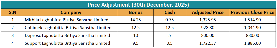 पुस १५ गते, मंगलबार, नेपाल स्टक एक्सचेञ्ज (नेप्से) मा ४ कम्पनीको शेयरमूल्य समायोजन भएको छ। यस दिन नेप्सेमा मिथिला लघुवित्त वित्तीय संस्था, छिमेक लघुवित्त वित्तीय संस्था, डिप्रोक्स लघुवित्त वित्तीय संस्था र सपोर्ट लघुवित्त वित्तीय संस्थाको शेयरमूल्य समायोजन भएको हो।