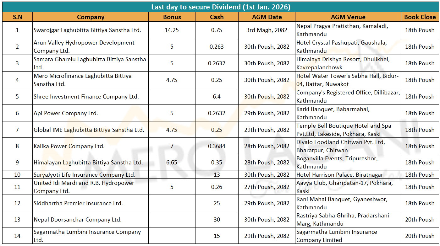 यस दिन स्वरोजगार लघुवित्त, अरुण भ्याली हाइड्रोपावर, समता घरेलु लघुवित्त, मेरा माइक्रोफाइनान्स, श्री इन्भेष्टमेन्ट फाइनान्स, अपि पावर, ग्लोबल आइएमई लघुवित्त, कालिका पावर, हिमालयन लघुवित्त, सूर्यज्योति लाइफ इन्स्योरेन्स, युनाइटेड इदी मार्दी एण्ड आरबि हाइड्रोपावर, सिद्धार्थ प्रिमियर इन्स्योरेन्स, नेपाल दूरसञ्चार कम्पनी र सगरमाथा लुम्बिनी इन्स्योरेन्सको लाभांश सुरक्षित गर्ने अन्तिम दिन हो।