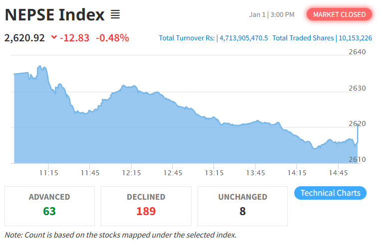बिहीबार नेप्से परिसूचक १२.८३ अंक घटेर २६२०.९२ विन्दुमा झरेको छ। त्यस्तै, यस दिन सेन्सेटिभ इण्डेक्स २.४३ अंक घटेको छ भने फ्लोट इण्डेक्स ०.८४ अंक र सेन्सेटिभ फ्लोट इण्डेक्स ०.८८ अंक घटेको छ।
