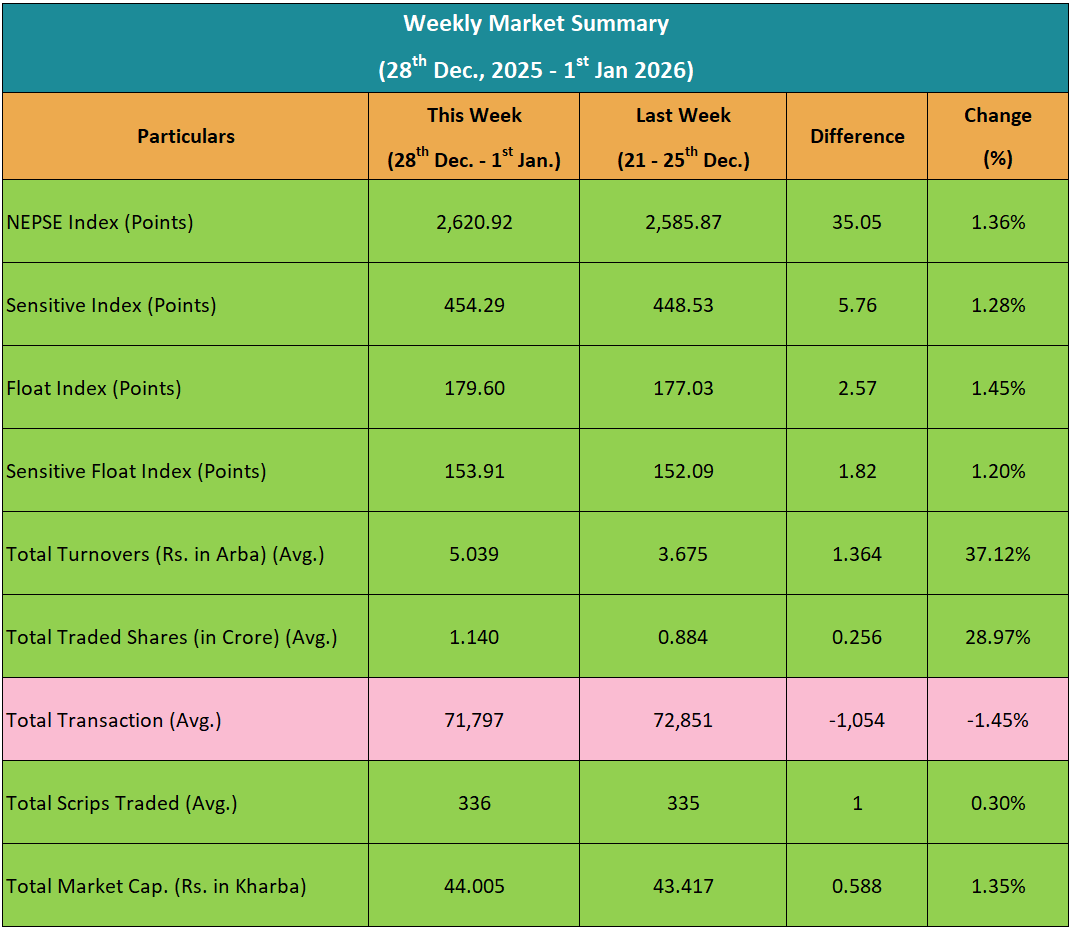 यस साता ४ कारोबार दिनका लागि बजार खुलेको थियो। जसमध्ये २ कारोबार दिन नेप्से बढेको थियो भने २ कारोबार दिन घटेको थियो।.