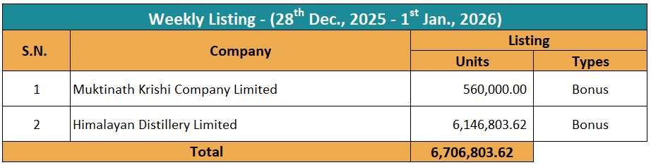 नेप्सेमा यस साता २ कम्पनीको ६७ लाख ६ हजार ८०३.६२ कित्ता शेयर सूचीकृत भएको छ। यस साता मुक्तिनाथ कृषि कम्पनी र हिमालयन डिष्टिलरीको बोनस शेयर नेप्सेमा सूचीकृत भएको हो।