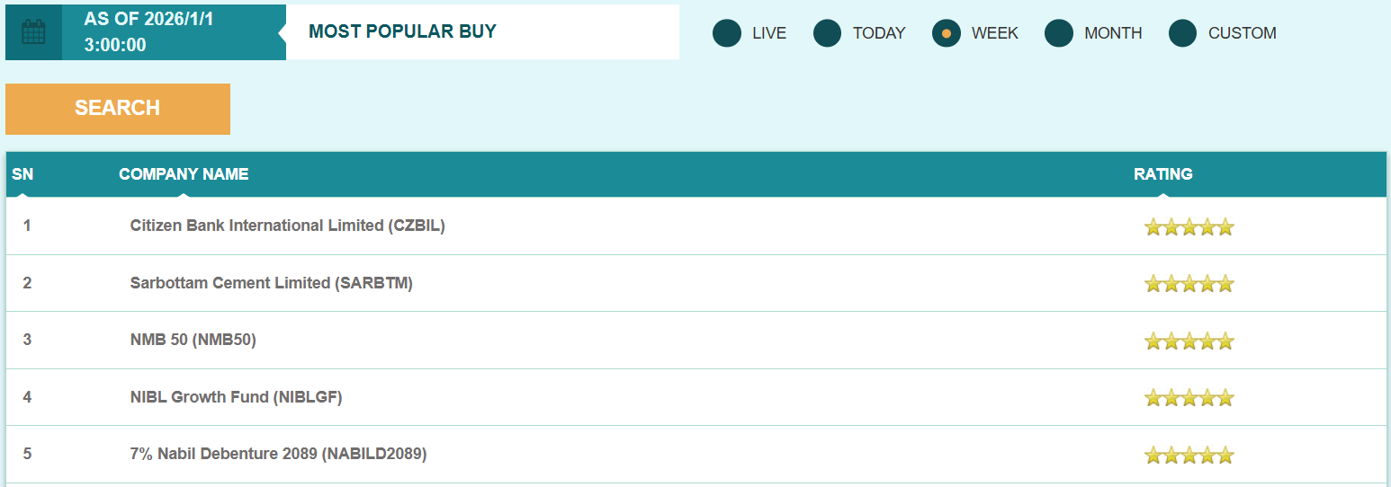 फ्लोरसिट विश्लेषण गर्दा यस साता सिटिजन्स बैंक इन्टरनेशनल, सर्वोत्तम सिमेन्ट, एनएमबि फिफ्टी लगायतका स्टकहरु मोस्ट पपुलर बाइ स्टक सूचीको शीर्ष स्थानमा रहेका छन् भने ग्रिन भेन्चर्स, मिथिला लघुवित्त वित्तीय संस्था, सपोर्ट लघुवित्त वित्तीय संस्था लगायतका स्टकहरु मोस्ट पपुलर सेल स्टक सूचीको शीर्ष स्थानमा रहेका छन्।