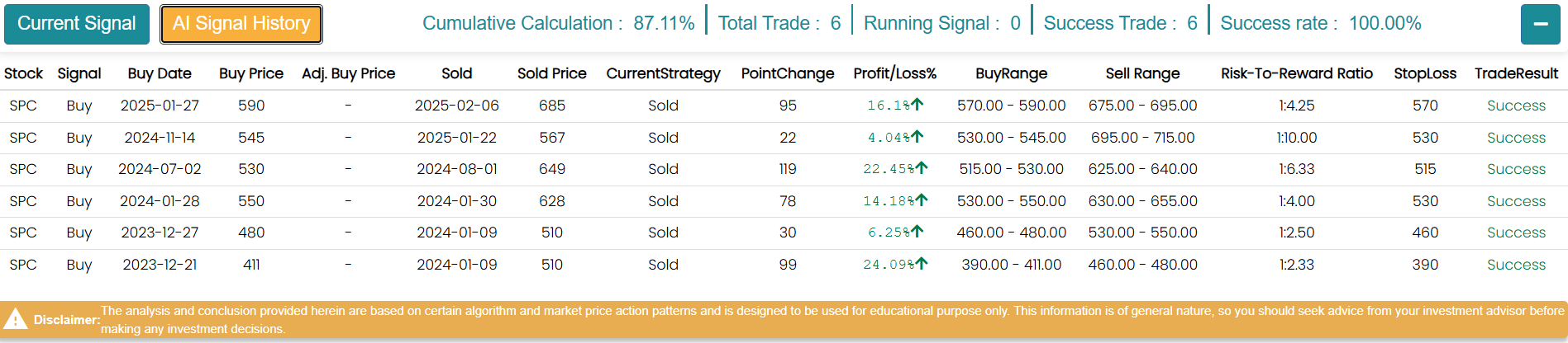 मेरोलगानी एआई चार्टले कम्पनीको शेयरमा हालसम्म ६ पटक बाइ सिग्नल दिइसकेको छ। ती सबै सिग्नलबाट लगानीकर्ताहरुले नाफा कमाएका थिए। हाल मेरोलगानी एआईले कम्पनीको शेयरमा कुनै सिग्नल दिएको छैन।
