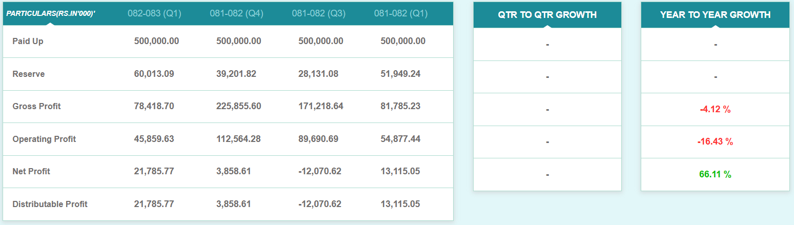 चालु आर्थिक वर्षको पहिलो त्रैमाससम्म कम्पनीले २ करोड १७ लाख ८५ हजार रुपैयाँ खुद नाफा कमाएको छ। यो गत आर्थिक वर्षको सोही अवधिको तुलनामा ६६.११ प्रतिशत बढी हो। गत आर्थिक वर्षको सोही अवधिसम्ममा कम्पनीले १ करोड ३१ लाख १५ हजार रुपैयाँ खुद नाफा कमाएको थियो।
