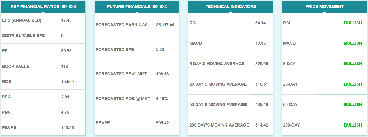 कम्पनीको पछिल्लो ५२ हप्ताको उच्च मूल्य ७२२ रुपैयाँ रहेको छ भने न्यून मूल्य ४४१ रुपैयाँ रहेको छ। कम्पनीको १८० दिने औषत मूल्य ५०४ रुपैयाँ ६५ पैसा रहेको छ।