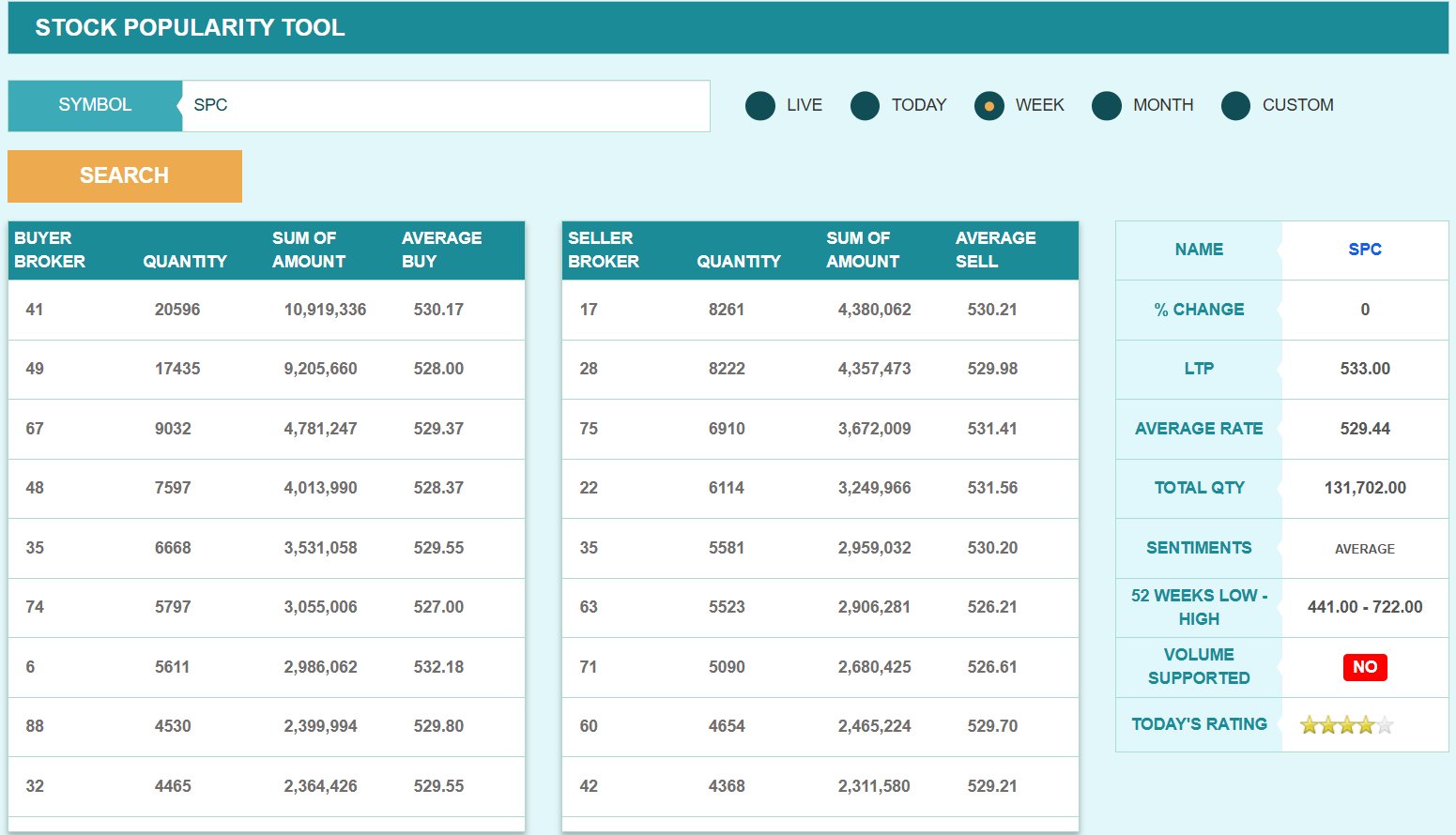 यस साता ब्रोकर नम्बर ४१ ले कम्पनीको सबैभन्दा बढी शेयर खरिद गरेको छ भने सर्वाधिक बिक्री गर्नेमा ब्रोकर नम्बर १७ रहेको छ। ४१ ले यस साता कम्पनीको २० हजार ५९६ कित्ता शेयर खरिद गरेको छ। त्यस्तै, ब्रोकर नम्बर ४९ ले कम्पनीको १७ हजार ४३५ कित्ता शेयर खरिद गरेको छ भने ६७ ले ९ हजार ३२ कित्ता शेयर खरिद गरेको छ। यस साता ब्रोकर नम्बर १७ ले भने कम्पनीको ८ हजार २६१ कित्ता शेयर बिक्री गरेको छ।