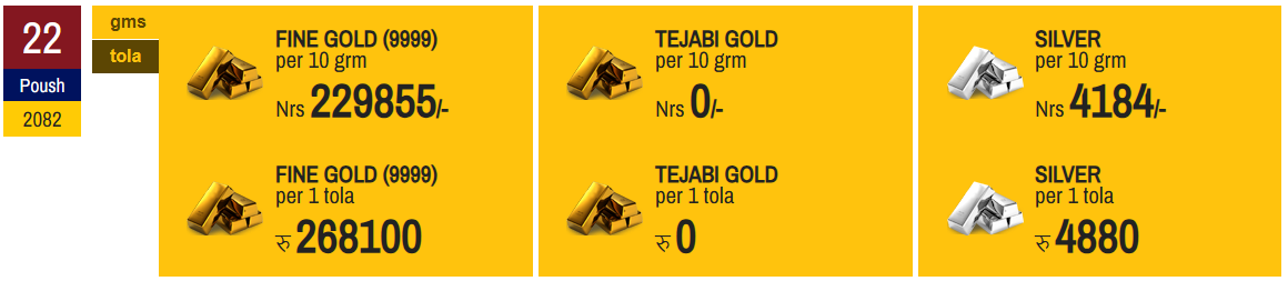 पछिल्ला दुई दिनदेखि सुन र चाँदीको मूल्यमा निरन्तरको उच्च वृद्धि भएको छ । नेपाल सुनचाँदी व्यवसायी महासंघका अनुसार आज सुन प्रतितोला २ लाख ६८ हजार १०० रुपैयाँमा कारोबार भइरहेको छ । सोमबारको बजारमा सुनको मूल्य प्रतितोला २ लाख ६५ हजार रुपैयाँमा कारोबार भएको थियो ।