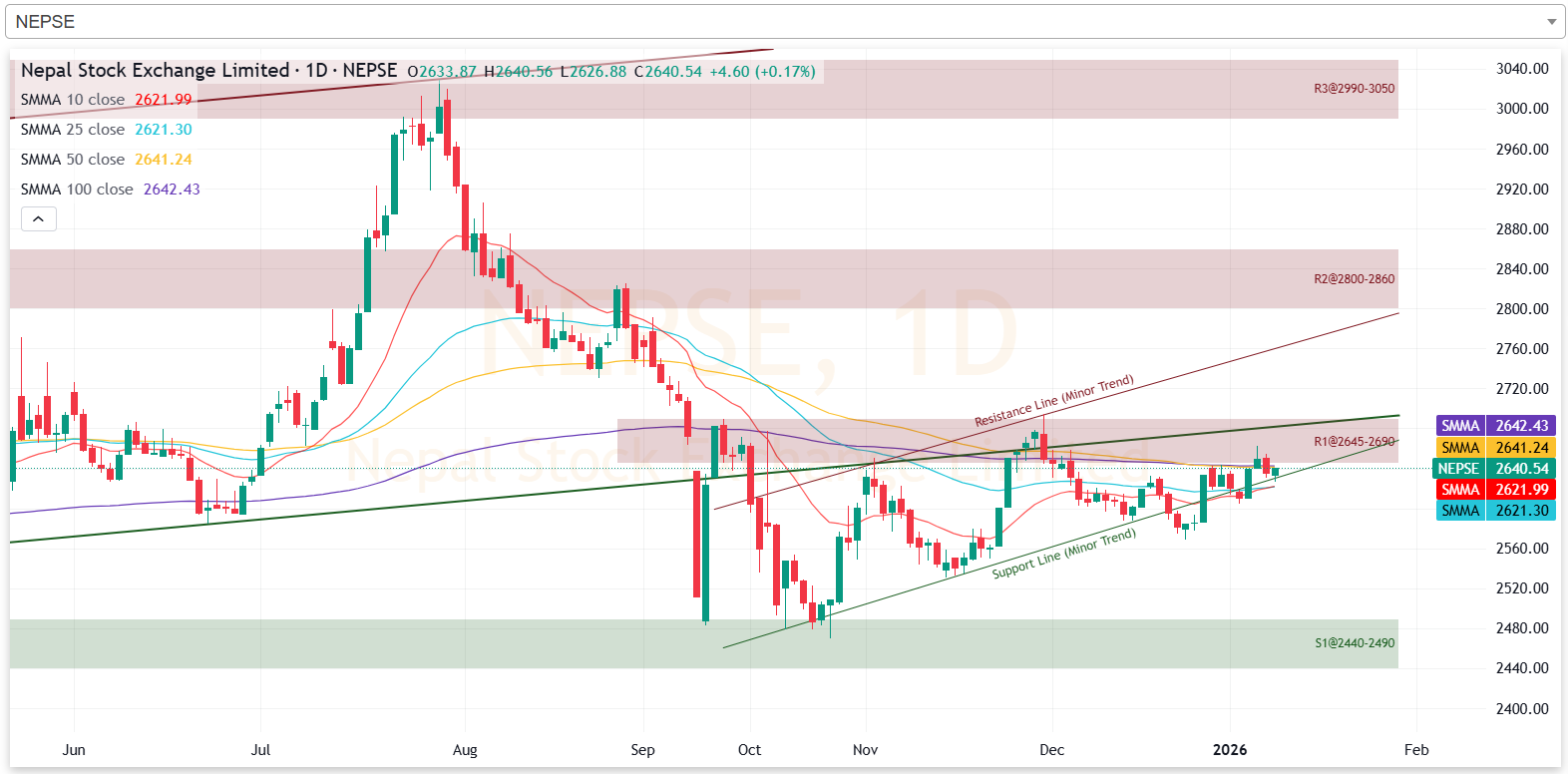 गत साता नेप्से परिसूचक प्रतिरोध परीक्षण गरेर झरेको छ। गत साता नेप्सेले २६४५ देखि २६९० सम्मको प्रतिरोध क्षेत्र परीक्षण गरेको हो। आगामी दिनमा नेप्सेले सो प्रतिरोध क्षेत्र तोडेर उकालो लागेमा २८०० देखि २८६० को क्षेत्रमा प्रतिरोधको सामना गर्नेछ। तर ओरालो लागेमा भने २४४० देखि २४९० को क्षेत्रमा टेवा पाउने देखिन्छ।
