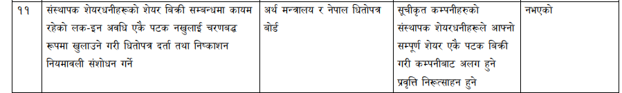 यही बेथितिलाई नजिकबाट नियालिरहेको नेपाल धितोपत्र बोर्डले अब आफ्नो नियमनको डन्डा चलाउने तयारी गरेको छ। बोर्डका अध्यक्ष सन्तोष नारायण श्रेष्ठका अनुसार, अब लक-इन अवधि सकिने बित्तिकै संस्थापकहरूलाई एकै पटक सबै शेयर बिक्री गरेर हिँड्न दिइने छैन। पूँजी बजार सुधार कार्यदलको सुझावलाई कार्यान्वयन गर्दै नेपाल धितोपत्र बोर्डले 'धितोपत्र दर्ता तथा निष्कासन नियमावली' संशोधन गर्ने तयारी गरेको छ। बोर्डका अध्यक्ष श्रेष्ठका अनुसार अब लक-इन अवधि सकिने बित्तिकै सबै शेयर एकै पटक खुल्ला नगरी चरणबद्ध रूपमा मात्र बिक्री गर्न पाउने गरी नियम परिमार्जन गरिँदै छ।