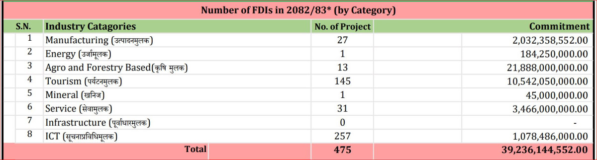 गत साउनदेखि पुस महिनासम्म भित्रिएको प्रत्यक्ष वैदेशिक लगानीको तथ्यांक हेर्दा सबैभन्दा बढी सूचना प्रविधिमूलक क्षेत्रका २५७ वटा उद्योगका लागि लगानी प्रतिवद्धता आएको छ । रकमका आधारमा भने कृषिमूलक क्षेत्रका १३ उद्योगमा सबैभन्दा धेरै २१ अर्ब ८८ करोड बराबरको लगानी प्रतिवद्धता आएको छ । उत्पादनमूलक क्षेत्रका २७ उद्योगमा २ अर्ब ३ करोड, पर्यटनमूलक क्षेत्रका १ सय ४५ उद्योगमा १० अर्ब ५४ करोड र सेवामूलक क्षेत्रका ३१ उद्योगमा ३ अर्ब ४६ करोड बराबरको प्रत्यक्ष वैदेशिक लगानी प्रतिबद्धता आएको छ ।