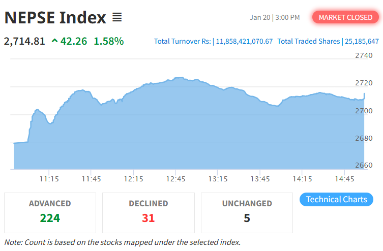 मंगलबार नेप्से परिसूचक ४२.२६ अंक बढेर २७१४.८१ विन्दुमा पुगेको छ। त्यस्तै, यस दिन सेन्सेटिभ इण्डेक्स ७.८२ अंक बढेको छ भने फ्लोट इण्डेक्स ३.१९ अंक र सेन्सेटिभ फ्लोट इण्डेक्स २.८७ अंक बढेको छ।