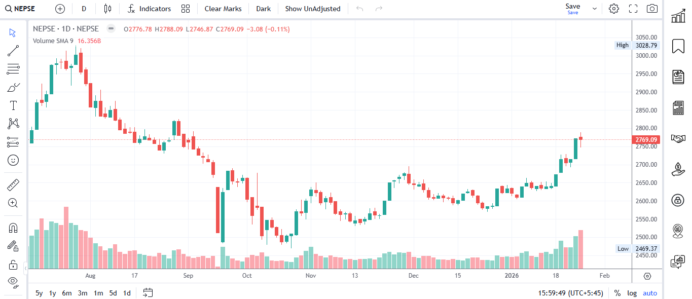 नेप्सेको दैनिक चार्टलाई गहिरिएर हेर्दा बजारले सन् २०२५ को मध्यतिर ३०२८.७९ को ' हाई' नजिक पुगेर एउटा ठुलो गिरावट व्यहोरेको देखिन्छ। चार्टमा २४६९.३७ को न्यून बिन्दु (लो) बनाएपछि बजारले 'डबल बटम' जस्तो आकृति बनाएर निकै बलियो 'रिकभरी' गरेको छ। चार्टको अन्तिम खण्डमा देखिएका लामा हरिया क्यान्डलहरू र पछिल्लो दुई दिनको भोल्युम बारलाई तुलना गर्दा बजारमा मागको चाप अत्यधिक बढेको देखिन्छ। आज सूचक सामान्य रातो हुँदा पनि भोल्युम बार निकै अग्लो देखिनुको अर्थ हो— बजारमा नाफा सुरक्षित गर्न शेयर बेच्नेहरू जति सक्रिय थिए, त्योभन्दा बढी आक्रामक रूपमा शेयर उठाउनेहरू बजारमा हाबी भए। यसले बजार अब छिट्टै ३००२ को अघिल्लो ५२ हप्ताको उच्च बिन्दुलाई चुनौती दिने तयारीमा रहेको प्राविधिक सङ्केत गर्दछ।