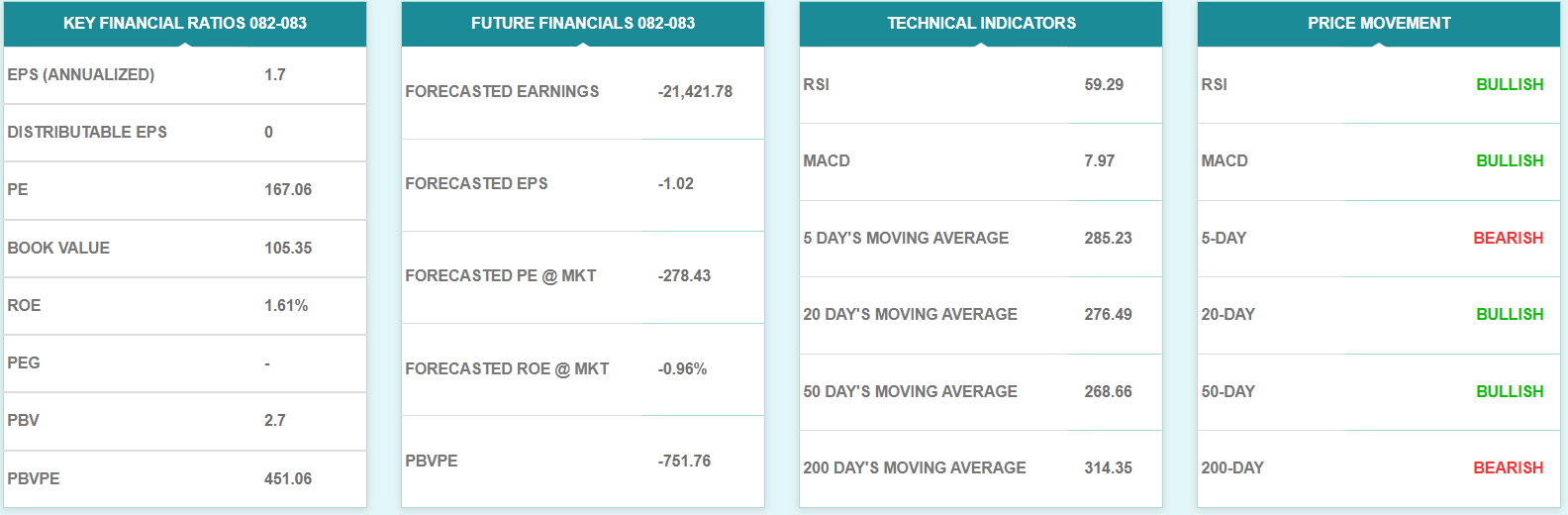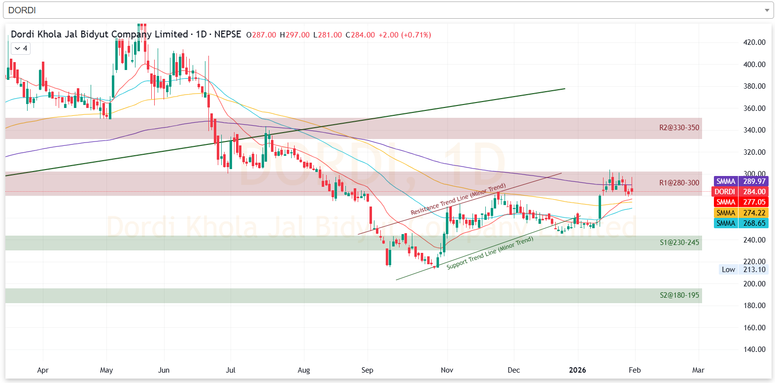 यस साता कम्पनीको शेयरमूल्य प्रतिरोध परीक्षणमा रहेको छ। हाल कम्पनीको प्रतिरोध क्षेत्र २८० दखि ३०० सम्म रहेको छ। यस साता कम्पनीको शेयरमूल्यले सो क्षेत्र परीक्षण गरिरहेको छ। आगामी साता कम्पनीको शेयरमूल्य सो क्षेत्र परीक्षण गरी तल झरेमा २३० देखि २४५ को क्षेत्रमा टेवा पाउनेछ। तर, सो प्रतिरोध तोडेर उकालो लागेमा भने ३३० देखि ३५० को क्षेत्रमा प्रतिरोधको सामना गर्नेछ।