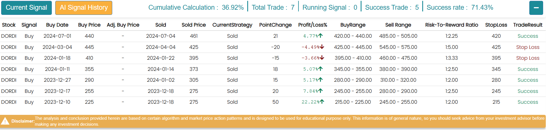 मेरोलगानी एआईले हालसम्म कम्पनीमा ७ सिग्नल दिइसकेको छ। जसमध्ये ५ सिग्नल सफल भएको थियो भने २ सिग्नलमा स्टप लस गर्नु परेको थियो। हाल मेरोलगानी एआईले कम्पनीको शेयरमा कुनै सिग्नल दिएको छैन।