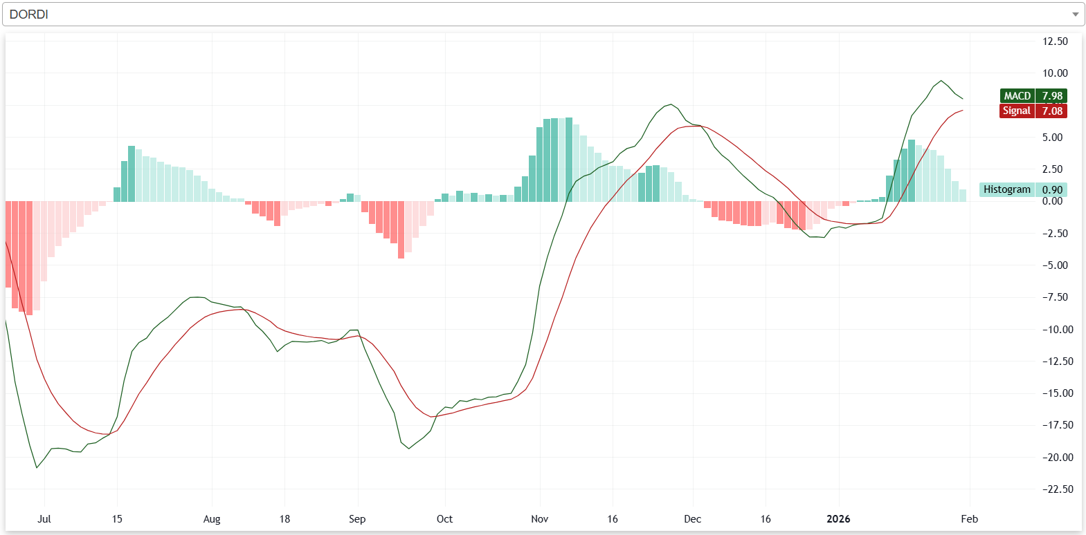 यस साता कम्पनीको एमएसिडी रेखा, सिग्नल रेखाभन्दा माथि रहेको छ। यसका साथै कम्पनीको हिस्टोग्राम पनि सकारात्मक क्षेत्र अर्थात शून्य रेखाभन्दा माथि रहेको छ। यसले कम्पनीको शेयरमूल्य बुलिश प्रवृत्तिमा रहेको संकेत गर्दछ। यद्यपि, साताको अन्त्यतिर एमएसिडी रेखा र सिग्नल रेखाबिचको दूरी र हिस्टोग्रामको उचाई दुबै घट्दो क्रममा रहेको छ।