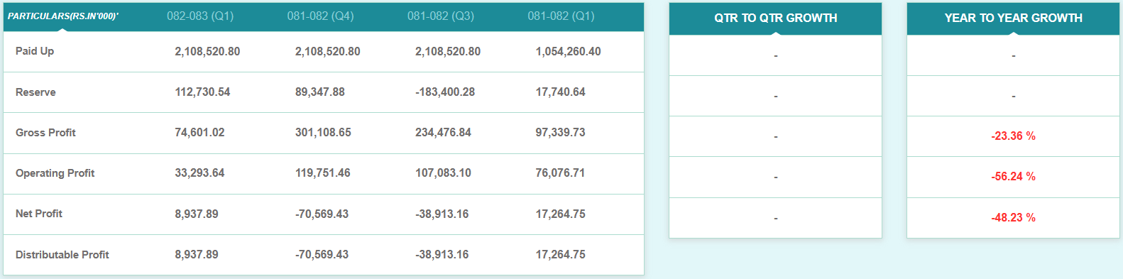 चालु आर्थिक वर्षको पहिलो त्रैमाससम्ममा कम्पनीले ८९ लाख ३७ हजार रुपैयाँ खुद नाफा आर्जन गरेको छ। गत आर्थिक वर्षको सोही अवधिसम्मको अपरिष्कृत वित्तीय विवरण अनुसार कम्पनीले सो अवधिसम्ममा १ करोड ७२ लाख ६४ हजार रुपैयाँ खुद नाफा कमाएको थियो। यद्यपि, चालु आर्थिक वर्षको पहिलो त्रैमाससम्मको अपरिष्कृत वित्तीय विवरणमा गत आर्थिक वर्षको पहिलो त्रैमाससम्मको खुद नाफा ३५ लाख ७९ हजार रुपैयाँ ऋणात्मक छ।