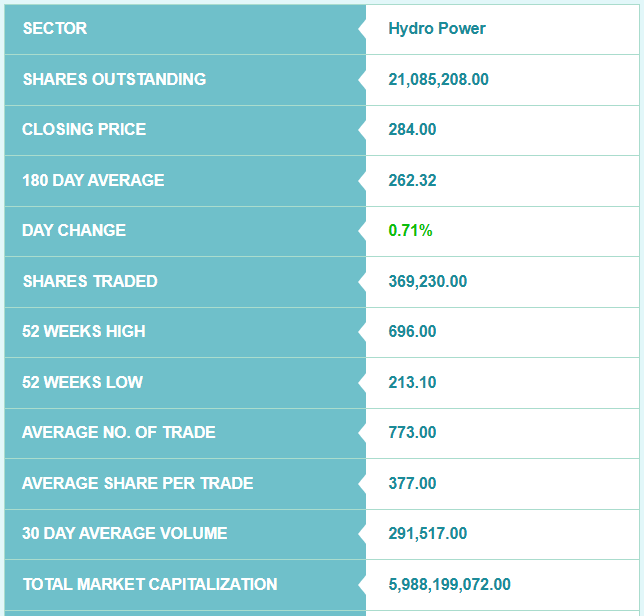 हाल नेप्सेमा कम्पनीको २ करोड १० लाख ८५ हजार २०८ कित्ता शेयर सूचीकृत छन्। कम्पनीको १८० दिने औषत मूल्य २६२ रुपैयाँ ३२ पैसा रहेको छ। त्यसैगरी, कम्पनीको ५२ हप्ताको उच्च मूल्य ६९६ रुपैयाँ रहेको छ भने न्यून मूल्य २१३ रुपैयाँ १० पैसा रहेको छ। साताको अन्तिम मूल्य अनुसार कम्पनीको कुल बजार पूँजीकरण ५ अर्ब ९८ करोड ८१ लाख ९९ हजार ७२ रुपैयाँ रहेको छ।