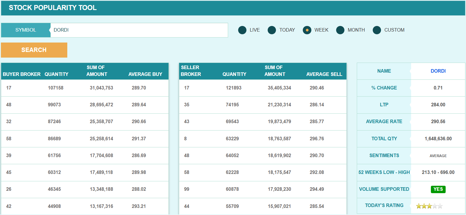 यस साता ब्रोकर नम्बर १७ ले कम्पनीको सबैभन्दा बढी शेयर खरिद गरेको छ। सो ब्रोकरले यस साता कम्पनीको १ लाख ७ हजार १५८ कित्ता शेयर खरिद गरेको छ। तर, सो ब्रोकरले यस साता त्योभन्दा बढी शेयर बिक्री गरेको छ। यस साता सो ब्रोकरले कम्पनीको १ लाख २१ हजार ८९३ कित्ता शेयर बिक्री गरेको छ। त्यसैगरी, यस साता ब्रोकर नम्बर ४८ ले कम्पनीको ९९ हजार ७३ कित्ता शेयर खरिद गरेको छ भने ब्रोकर ३५ ले ७४ हजार १९५ कित्ता शेयर बिक्री गरेको छ।