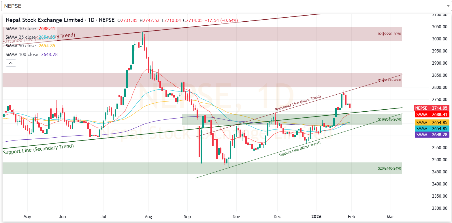 अघिल्लो साता २६४५ देखि २६९० सम्मको प्रतिरोध तोडेर उक्लिएको नेप्से हाल सोही क्षेत्र नजिक झरेको छ। सो क्षेत्र हाल नेप्सेको टेवा क्षेत्र हो। आगामी दिनमा नेप्सेले ओरालो लाग्ने क्रमलाई निरन्तरता दिएमा सोही क्षेत्रमा टेवा पाउनेछ। यद्यपि, यस साता नेप्से उकालो लागेमा भने २८०० देखि २८६० को क्षेत्रमा प्रतिरोधको सामना गर्ने देखिन्छ।