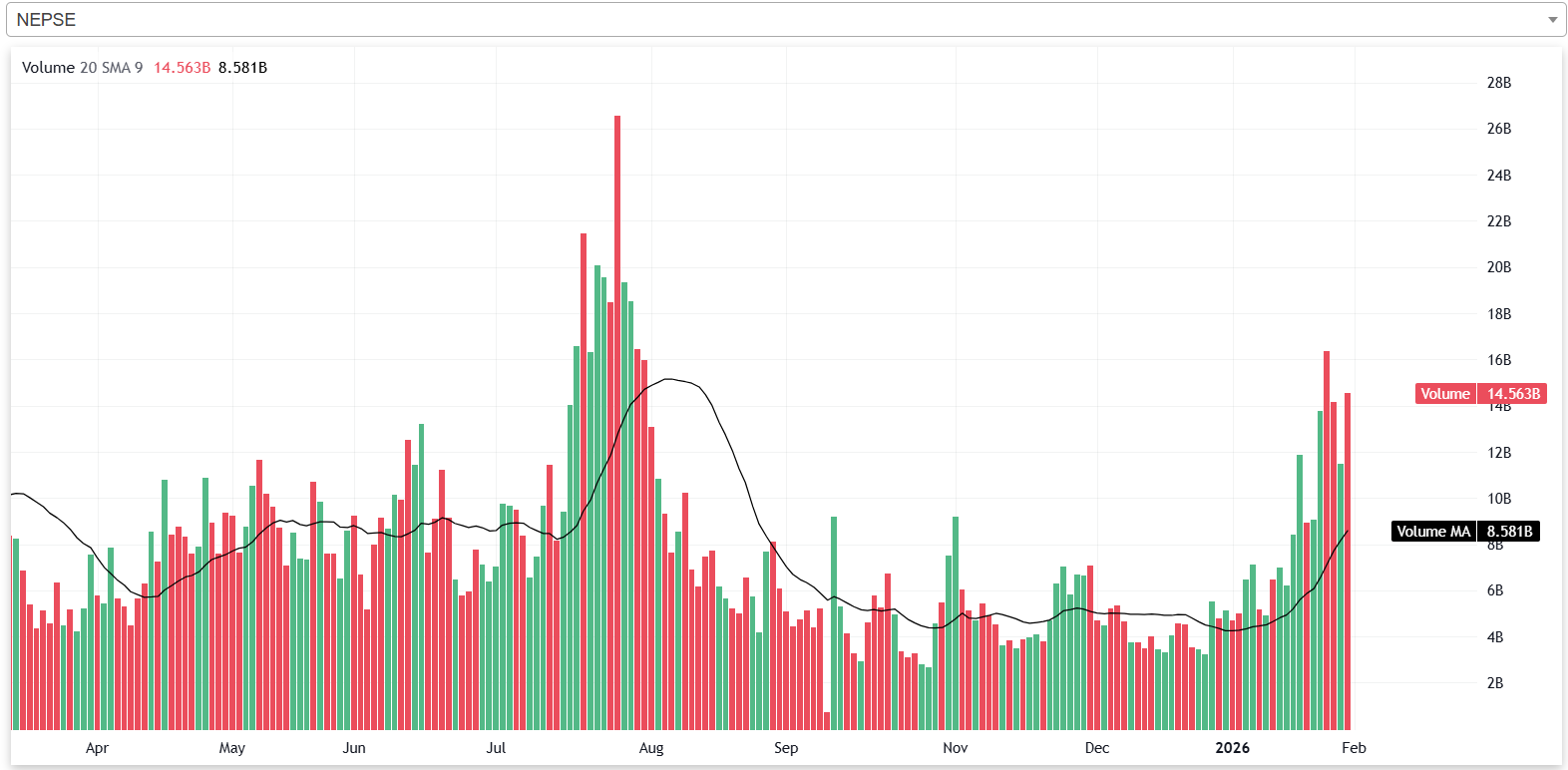 गत साता नेप्सेको भोल्यूम बलियो रहेको छ। गत साता नेप्सेमा दैनिक औषतमा १४ अर्ब ७ करोडको शेयर कारोबार भएको थियो। साताको अन्तिम कारोबार दिन नेप्सेको २० दिने औषत भोल्यूम ८ अर्ब ५८ करोड रहेको छ। २० दिने औषत भोल्यूमको तुलनामा गत साताको दैनिक औषत भोल्यूम ६३.९८ प्रतिशत बढी हो।