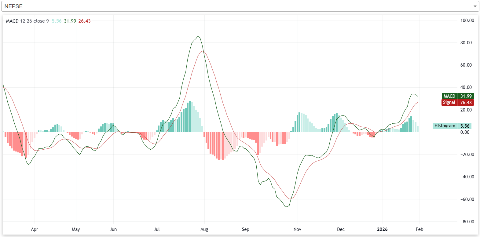 गत साता नेप्सेको एमएसिडी रेखा सिग्नल रेखाभन्दा माथि रहेको छ भने यी दुबै रेखाहरु र हिस्टोग्राम सकारात्मक क्षेत्रमा रहेका छन्। यद्यपि साताको अन्त्यतिर यी दुई रेखाहरुबीचको दूरी र हिस्टोग्रामको उचाई घट्दो क्रममा रहेको छ। यसले गत साता नेप्से बुलिश प्रवृत्तिमा रहेपनि अन्त्यतिर बुलिश सेन्टिमेन्ट घट्न थालेको संकेत गर्दछ ।