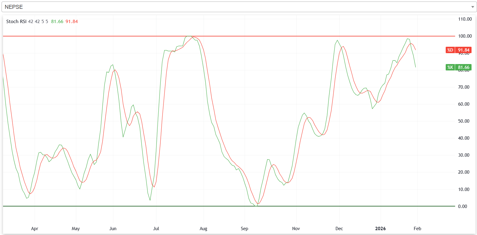 गत साता नेप्सेको स्टकास्टिक आरएसआई ओभरबट जोनबाट न्यूट्रल जोनतर्फ झरिरहेको छ। यसले गत साता बजारमा खरिदचाप घट्न थालेको संकेत गर्दछ।