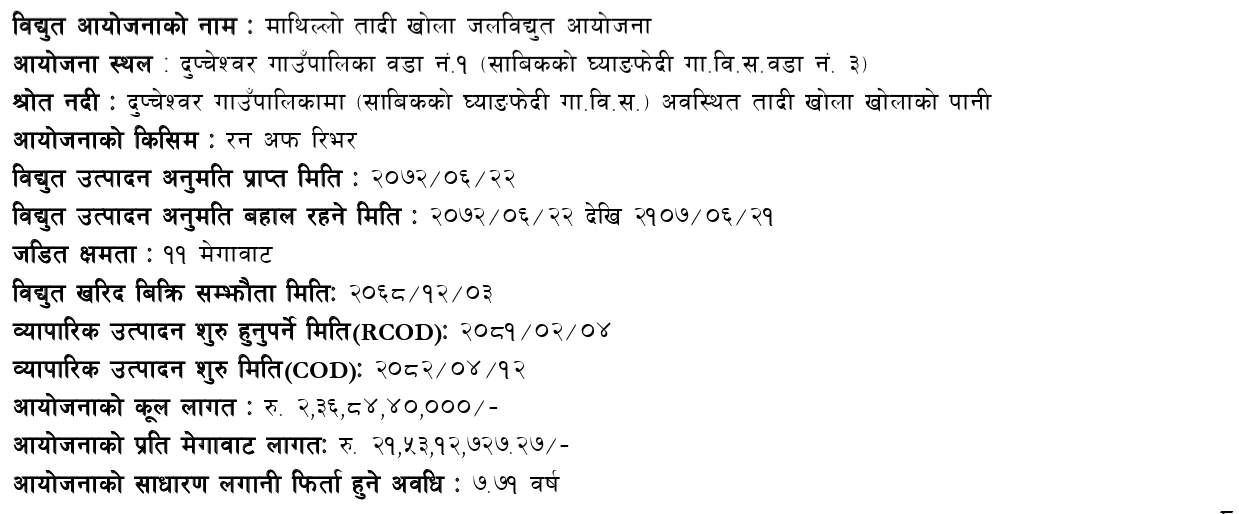 कम्पनीले ११ मेगावाटको तादी खोला जलविद्युत आयोजना उत्पादन तथा सञ्चालन गर्न नेपाल सरकार, ऊर्जा मन्त्रालयबाट २०७२ असोज २२ गते अनुमतिपत्र प्राप्त गरेको हो र सो अनुरुप कम्पनीको विद्युत उत्पादन अनुमति पत्र २६ वर्ष बाँकी रहेको छ।