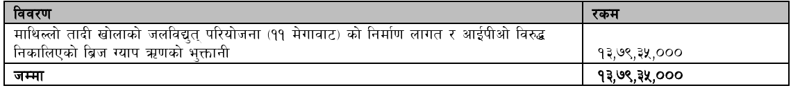 साधारण शेयर निष्काशन गरि प्राप्त हुने १३ करोड ७९ लाख ३५ हजार रुपैयाँ कम्पनीले ऋण प्रदायक बैंक तथा वित्तीय संस्थाहरु (लिड बैंक कुमारी बैंक लिमिटेड र को लिड बैंक नेपाल एसबिआई बैंक लिमिटेड) सँग भएको सम्झौता बमोजिम लिएको ऋण रकमको साँवा भुक्तानी गर्न उपयोग गर्नेछ।