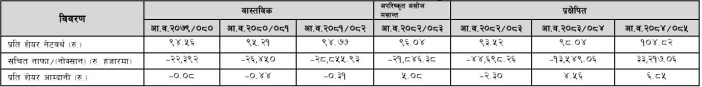 चालु आर्थिक वर्षको अन्त्यसम्ममा कम्पनीले सञ्चित नोक्सानी ४ करोड ४६ लाख रुपैयाँ पुग्ने प्रक्षेपण गरेको छ। सो अवधिसम्ममा कम्पनीको प्रतिशेयर नेटवर्थ ९३ रुपैयाँ ५२ पैसा पुग्ने प्रक्षेपण गरेको छ भने प्रतिशेयर आम्दानी २ रुपैयाँ ३० पैसा ऋणात्मक रहने प्रक्षेपण गरेको छ।