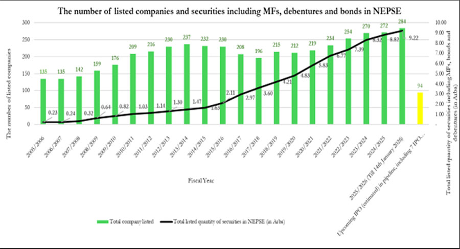 यद्यपि, विगत तीन दशकमा नेपालको पूँजी बजार द्रुत गतिमा विस्तार भएको छ। १४ जनवरी, २०२६ सम्ममा नेप्सेमा २८४ सूचीकृत कम्पनीहरू पुगेका छन्, जसमा लाखौँ लगानीकर्ताहरूसँग डिम्याट खाता छ र अनलाइन कारोबार सामान्य बनेको छ।
