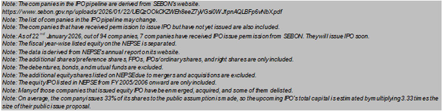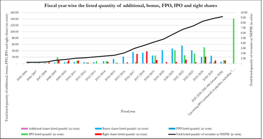 माथिका तथ्याङ्कहरूबाट हामी देख्न सक्छौँ कि नेप्सेमा सूचीकृत धितोपत्रको परिमाण र सूचीकृत कम्पनीहरूको सङ्ख्या प्रत्येक वर्ष बढिरहेको छ। साथै, सूचीकृत कम्पनीहरूले बोनस शेयर, हकप्रद (राइट) र थप सार्वजनिक निष्काशन (FPO) तथा थप शेयरहरू जारी गरिरहेका छन्, जसले नेप्सेमा सूचीकृत धितोपत्रहरूको आपूर्ति बढाएको छ।