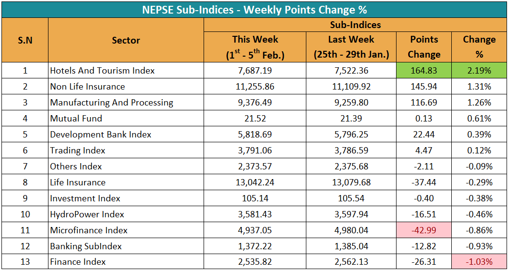 १३ उपसमूहमध्ये यस साता ६ उपसमूहको परिसूचक बढेको छ भने ७ उपसमूहको परिसूचक घटेको छ। यस साता होटल तथा पर्यटन उपसमूहको परिसूचक सर्वाधिक २.१९ प्रतिशत बढेको छ। गत साता ७५२२.३६ विन्दुमा बन्द भएको यस उपसमूहको परिसूचक, यस साता १६४.८३ अंक बढेर ७६८७.१९ विन्दुमा पुगेको छ। अंकका आधारमा पनि यस साता सोही उपसमूहको परिसूचक सर्वाधिक बढेको छ।