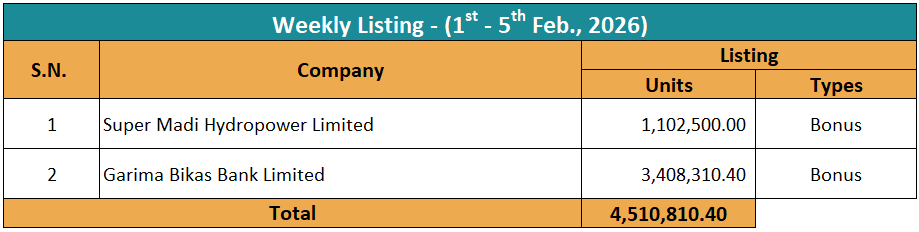 यस साता दुई कम्पनीको कुल ४५ लाख १० हजार ८१०.४० कित्ता शेयर नेप्सेमा सूचीकृत भएको छ। यस साता सुपर मादी हाइड्रोपावर र गरिमा विकास बैंकको बोनस शेयर नेप्सेमा सूचीकृत भएको हो।