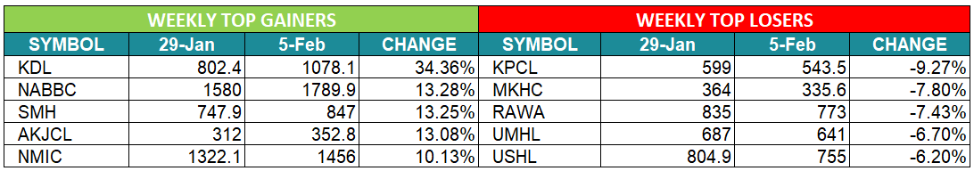 यस साता कालिञ्चोक दर्शनको शेयरमूल्य सर्वाधिक ३४.३६ प्रतिशत बढेको छ। गत साता ८०२ रुपैयाँ ४० पैसामा अन्तिम कारोबार भएको सो कम्पनीको शेयर यस साता १ हजार ७८ रुपैयाँ १० पैसामा अन्तिम कारोबार भएको छ। त्यस्तै, यस साता नारायणी डेभलपमेन्ट बैंक र सुपर माई हाइड्रोपावरको शेयरमूल्य करिब साढे १३ प्रतिशत बढेको छ भने आँखु खोला जलविद्युत कम्पनीको शेयरमूल्य १३ प्रतिशतभन्दा बढी बढेको छ। यस साता कालिका पावरको शेयरमूल्य सर्वाधिक ९.२७ प्रतिशत घटेको छ। अन्य स्टकहरुको मूल्य गिरावट दर भने ८ प्रतिशतभन्दा कम रहेको छ।