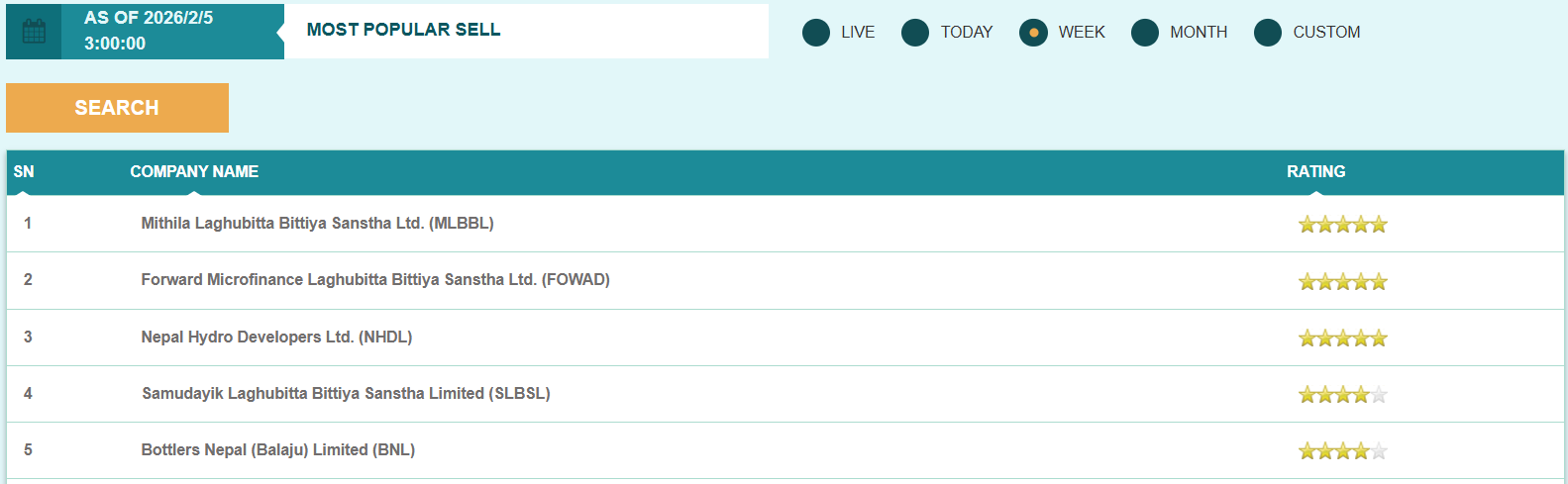 फ्लोरसिट विश्लेषण गर्दा यस साता मेगा म्युचुअल फण्ड १, स्ट्याण्डर्ड चार्टर्ड बैंक, कालिञ्चोक दर्शन लगायतका स्टकहरु मोस्ट पपुलर बाइ स्टक सूचीको शीर्ष स्थानमा रहेका छन् भने मिथिला लघुवित्त वित्तीय संस्था, फरवार्ड माइक्रोफाइनान्स लघुवित्त वित्तीय संस्था, नेपाल हाइड्रो डेभलोपर्स लगायतका स्टकहरु मोस्ट पपुलर सेल स्टक सूचीको शीर्ष स्थानमा रहेका छन्।