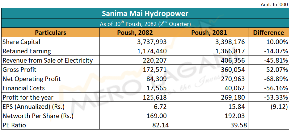 समीक्षा अवधिमा कम्पनीको विद्युत बिक्री आम्दानी ४५.८१ प्रतिशत घटेको छ भने कुल नाफा ५२.०७ प्रतिशत घटेको छ। त्यस्तै, कम्पनीको कुल सञ्चालन मुनाफा समीक्षा अवधिमा ६८.८९ प्रतिशत र वित्तीय खर्च ५६.१६ प्रतिशत घटेको छ।