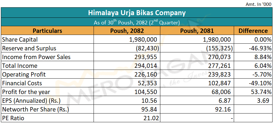 विद्युत बिक्री आम्दानी बढेसँगै कम्पनीको नाफा पनि बढेको छ। समीक्षा अवधिमा कम्पनीको खुद नाफा ६ करोड ८० लाख रुपैयाँबाट बढेर १० करोड ४५ लाख रुपैयाँ पुगेको छ। कम्पनीको खुद नाफा समीक्षा अवधिमा ५३.७४ प्रतिशत बढेको हो। विद्युत बिक्री आम्दानी सामान्य बढेपनि वित्तीय खर्च घटेका कारण कम्पनीको खुद नाफा वृद्धिदर बढी भएको हो।