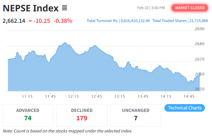 यस दिन नेप्से परिसूचक १०.२५ अंक घटेर २६६२.१४ विन्दुमा झरेको छ। त्यस्तै, यस दिन सेन्सेटिभ इण्डेक्स १.२६ अंक घटेको छ भने फ्लोट इण्डेक्स ०.८२ अंक र सेन्सेटिभ फ्लोट इण्डेक्स ०.५६ अंक घटेको छ।