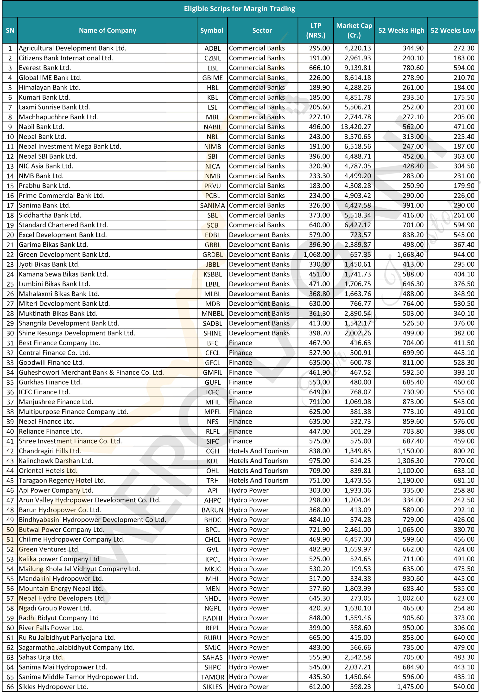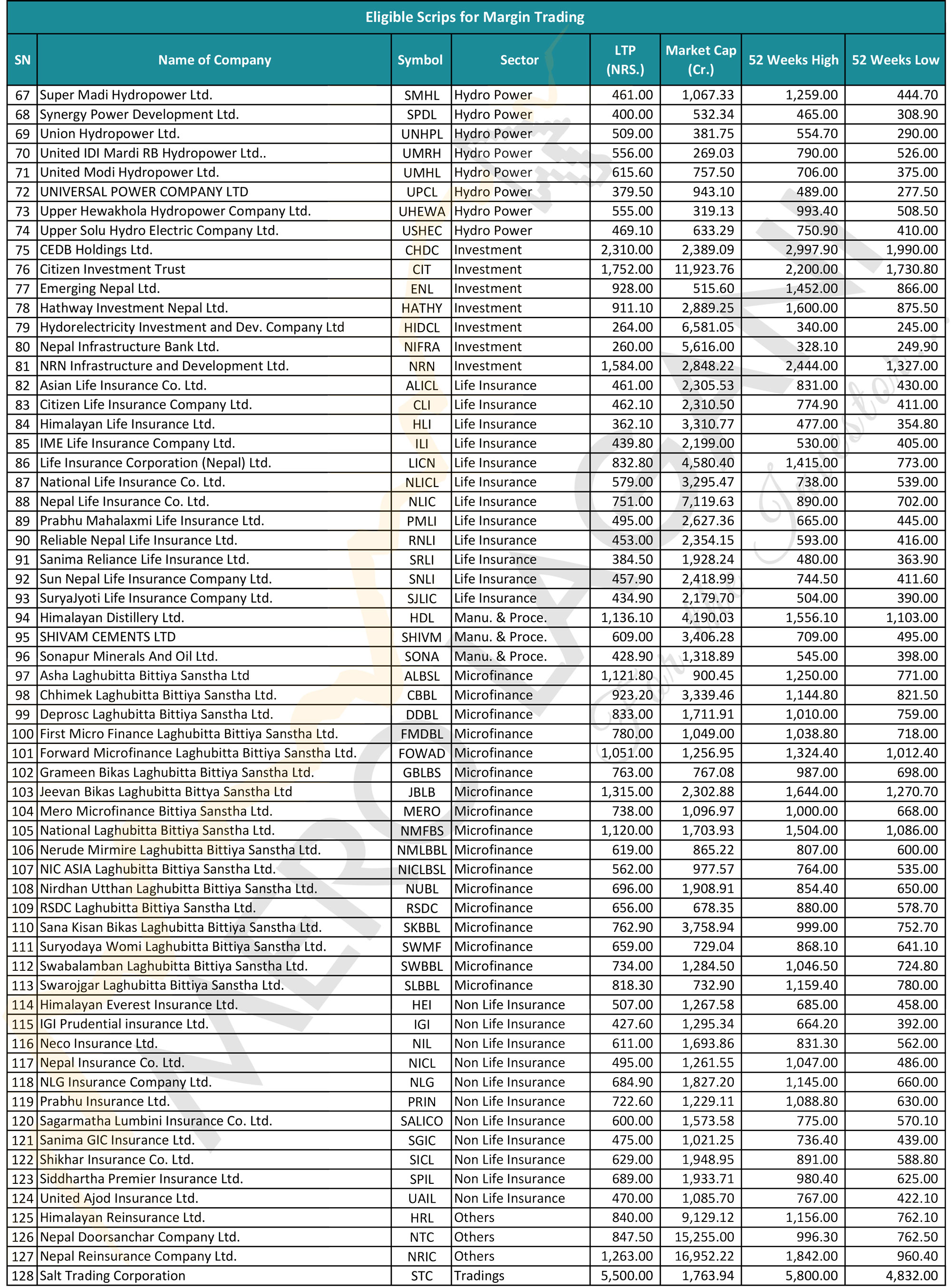 नोट: मार्जिन कारोबारका लागि योग्य १२८ कम्पनीको यो सूची तयार गर्दा मेरो लगानीले केही निश्चित आधारहरू लिएको छ। कम्पनीहरूको नेटवर्थ र नाफाको विवरणका लागि गत आर्थिक वर्ष २०८१/८२ को चौथो त्रैमासको वित्तीय विवरणलाई आधार मानिएको छ। नाफाको निरन्तरता हेर्न पछिल्लो तीन आर्थिक वर्ष (२०७९/८०, २०८०/८१ र २०८१/८२) को चौथो त्रैमासिक रिपोर्टहरू विश्लेषण गरिएको छ। कम्पनी सूचीकरण भएको दुई वर्ष पूरा भएको हुनुपर्ने प्रावधानका लागि हालको मितिबाट गणना गरिएको छ। जसमा सन् २०२४ मार्च १८ यता सूचीकरण भएका नयाँ कम्पनीहरूलाई यो गणनामा समावेश गरिएको छैन।