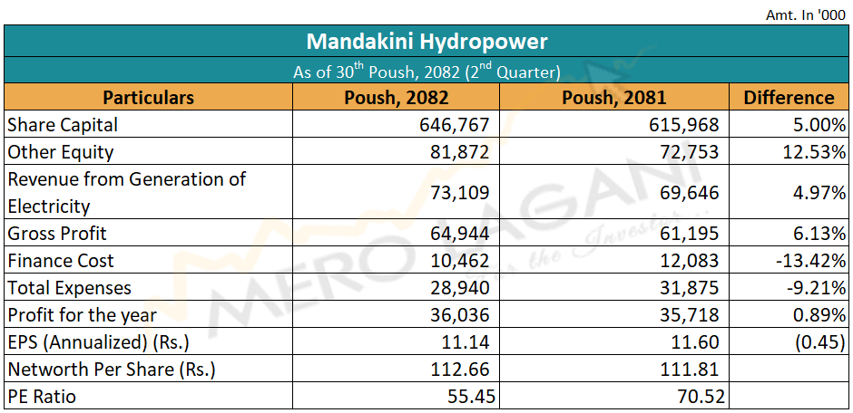 विद्युत बिक्री आम्दानीसँगै कम्पनीको खुद नाफा पनि सामान्य बढेको छ। समीक्षा अवधिमा कम्पनीको खुद नाफा ०.८९ प्रतिशत बढेर ३ करोड ६० लाख रुपैयाँ पुगेको छ। समीक्षा अवधिमा कम्पनीको कुल नाफा ६.१३ प्रतिशत बढेको छ। त्यस्तै, समीक्षा अवधिमा कम्पनीको वित्तीय खर्च १३.४२ प्रतिशत घटेको छ भने कुल खर्च ९.२१ प्रतिशत घटेको छ।