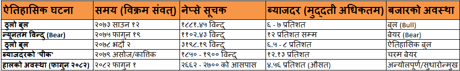 यो संशयलाई चिर्नुअघि हामीले विगतका केही निर्णायक 'बुल' र 'बेयर' चक्रमा ब्याजदर र नेप्सेले कसरी एक अर्कालाई पछ्याएका थिए भन्ने आधिकारिक तथ्याङ्कलाई हेर्नुपर्छ। यसले यो मानक किन यति बलियो गरी स्थापित भयो भन्ने प्रस्ट पार्छ।