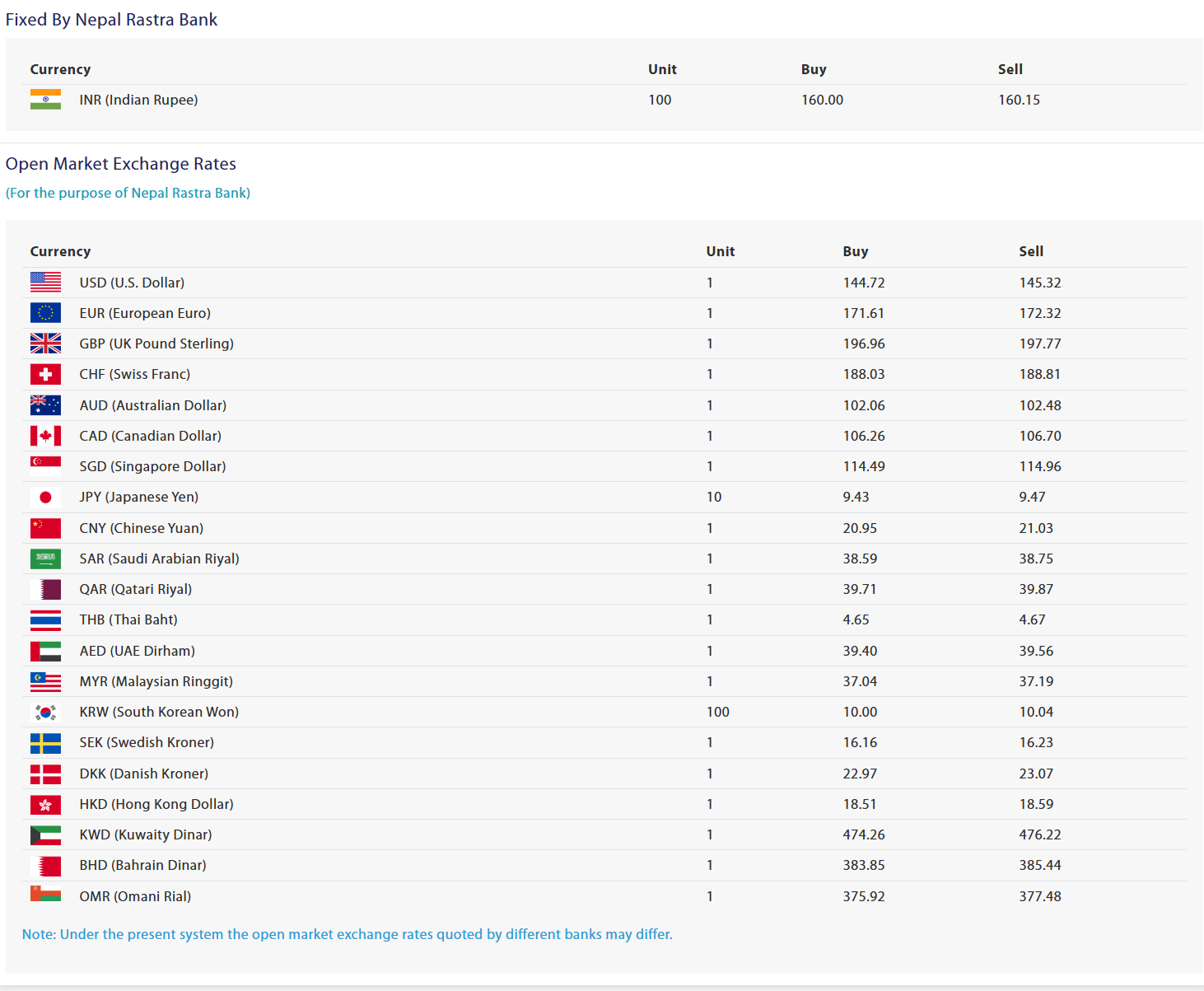 यस्तै, युरोपियन युरो एकको खरिददर १७१ रुपैयाँ ६१ पैसा र बिक्रीदर १७२ रुपैयाँ ३२ पैसा, युके पाउण्ड स्ट्रलिङ एकको खरिददर १९६ रुपैयाँ ९६ पैसा र बिक्रीदर १९७ रुपैयाँ ७७ पैसा, स्वीस फ्रयाङ्क एकको खरिददर १८८ रुपैयाँ ०३ पैसा र बिक्रीदर १८८ रुपैयाँ ८१ पैसा कायम गरिएको छ।