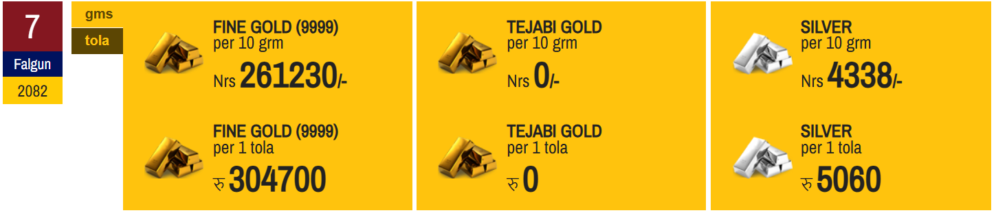 फागुन ७ गते, बिहीबार, नेपाली बजारमा सुन र चाँदीको मूल्य बढेको छ । यस दिन सुन प्रतितोला ४ हजार ३०० रुपैयाँ र चाँदी तोलामा १८० रुपैयाँले बढेको हो ।