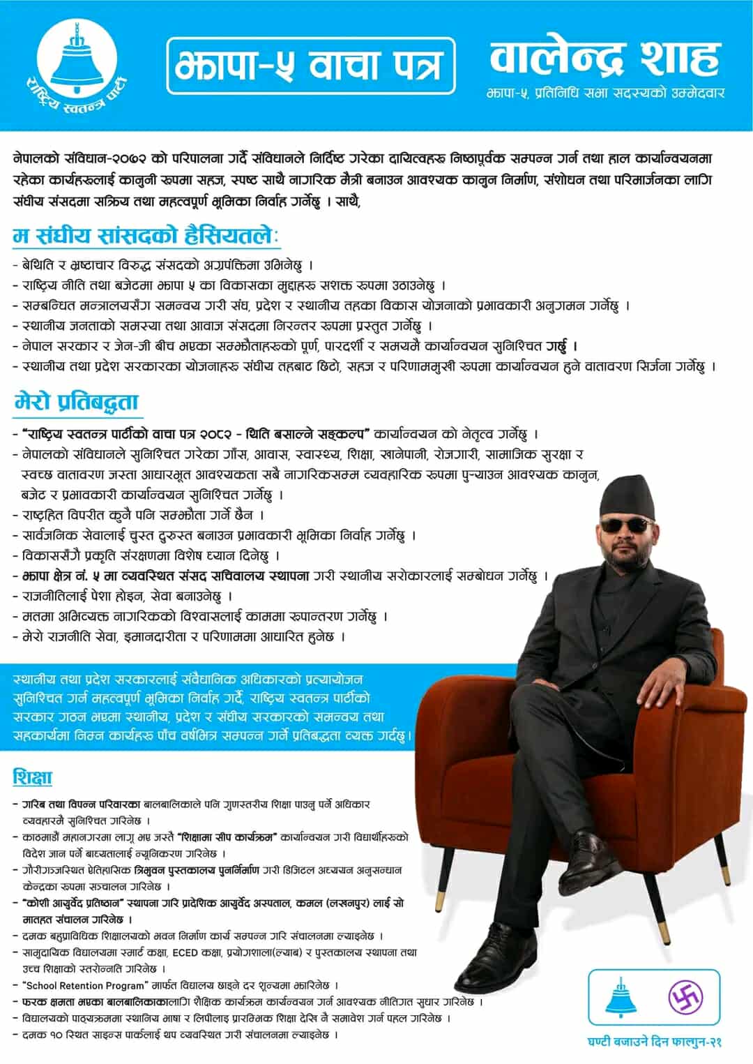 झापा–५ बाट प्रतिनिधिसभा सदस्य उमेदवार बनेका बालेनले घोषणापत्रलाई ‘झापा–५ वाचापत्र’ नाम दिएका छन् ।