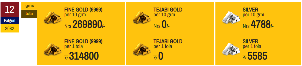 नेपाल सुनचाँदी व्यवसायी संघका अनुसार यस दिन छापावाल सुन प्रतितोला ३ लाख १४ हजार ८०० रुपैयाँमा कारोबार भइरहेको छ। अघिल्लो दिन अर्थात सोमबार यस्तो सुन प्रतितोला ३ लाख १३ हजार ५०० रुपैयाँमा कारोबार भएको थियो।