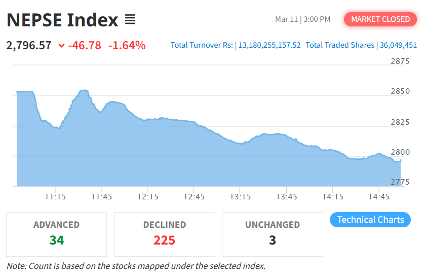 यस दिन नेप्से परिसूचक ४६.७८ अंक घटेर २७९६.५७ विन्दुमा झरेको छ। त्यस्तै, यस दिन सेन्सेटिभ इण्डेक्स ८.३२ अंक घटेको छ भने फ्लोट इण्डेक्स ३.२४ अंक र सेन्सेटिभ फ्लोट इण्डेक्स २.९४ अंक घटेको छ।