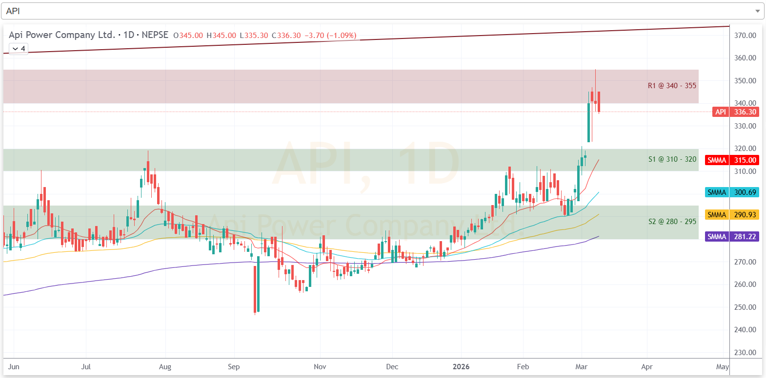 साताको अन्तिम कारोबार दिन कम्पनीको शेयरमूल्य प्रतिरोध क्षेत्रभन्दा तल झरेको छ। हाल कम्पनीको प्रतिरोध क्षेत्र ३४० देखि ३५५ सम्म रहेको छ। यस साता कम्पनीको शेयरमूल्य सो क्षेत्रमा प्रतिरोधको सामना गरी तल झरेको हो। आगामी दिनमा कम्पनीको शेयरमूल्य ओरालो लागेमा ३१० देखि ३२० को क्षेत्रमा टेवा पाउने देखिन्छ।